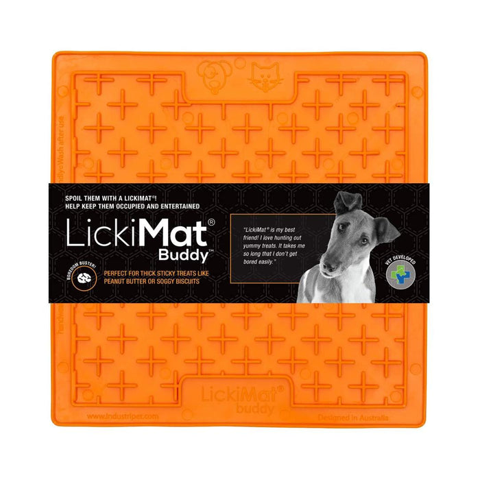 LickiMat® Buddy™ is designed for all sizes and breeds. With its cross-pattern surface, it is perfect as a slow feeder and as a treat maker. When used with tasty soft foods, like smashed banana, raw food, wet food, canned food, yoghurt and peanut butter, it makes long lasting, tasty, lickable treats.